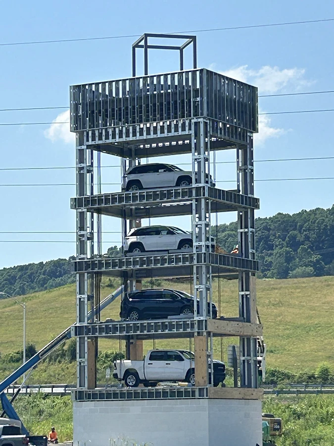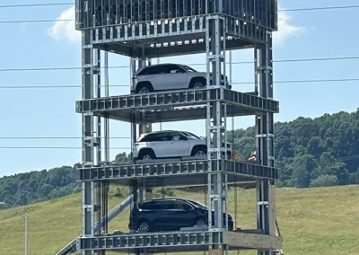 This project involved design/build of a 71’ tall vehicle display tower with four (4) separate display platforms to showcase vehicles. The elevator lift system was manufactured and shipped from Brazil adding logistical and scheduling challenges to the project. The tower features a fully customizable lighting system and illuminated signage. The tower was designed to showcase multiple automobiles utilizing minimal land area while combining functionality with aesthetic appeal, creating a striking visual that captivates and attracts attention. It was also designed to be brand non-specific so that multiple brands can be displayed at the same time. This building incorporated a regency stone masonry base and ACM panels. There are customizable exterior ground lights and high lumen interior lights to showcase the automobiles.