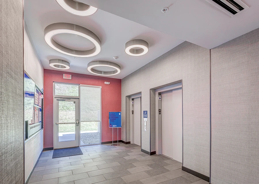 This 3-story 98-room hotel is constructed at I-81 Exit 74 as part of the Centre Pointe Development. The entry area has public space (front desk, fitness, game zone, business zone, and dining area) and access to guest rooms. The second through forth floors accommodate guest rooms. The hotel also has an outdoor lounge area.